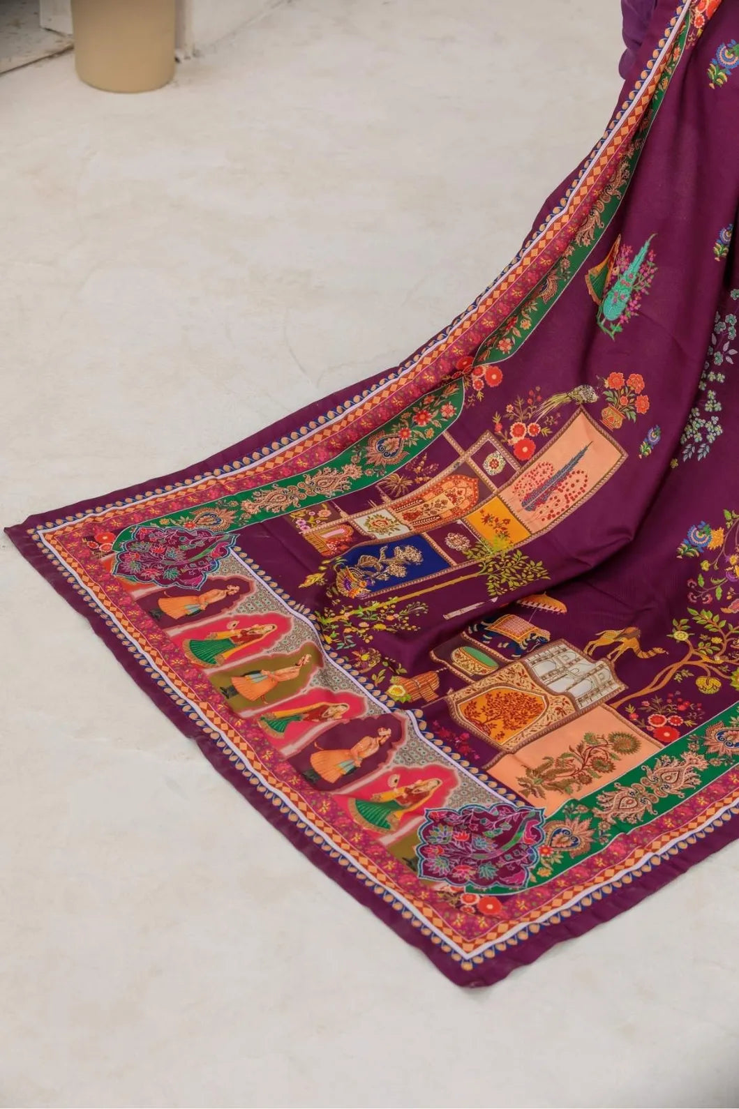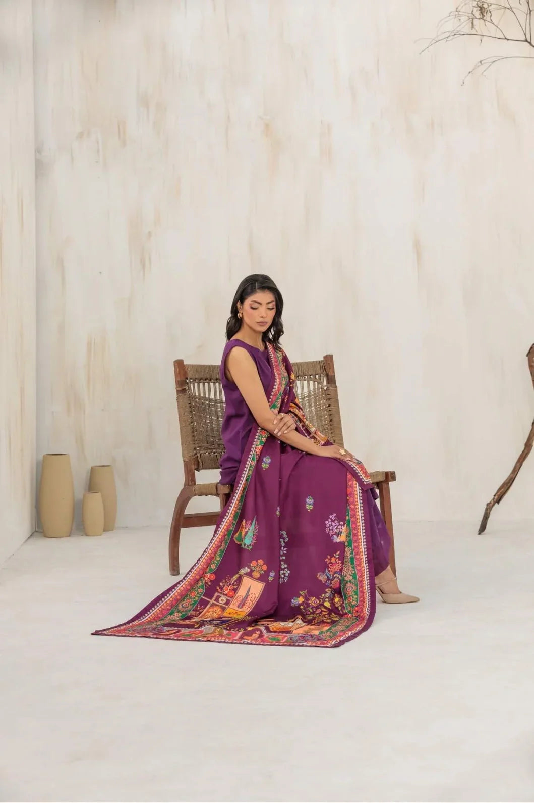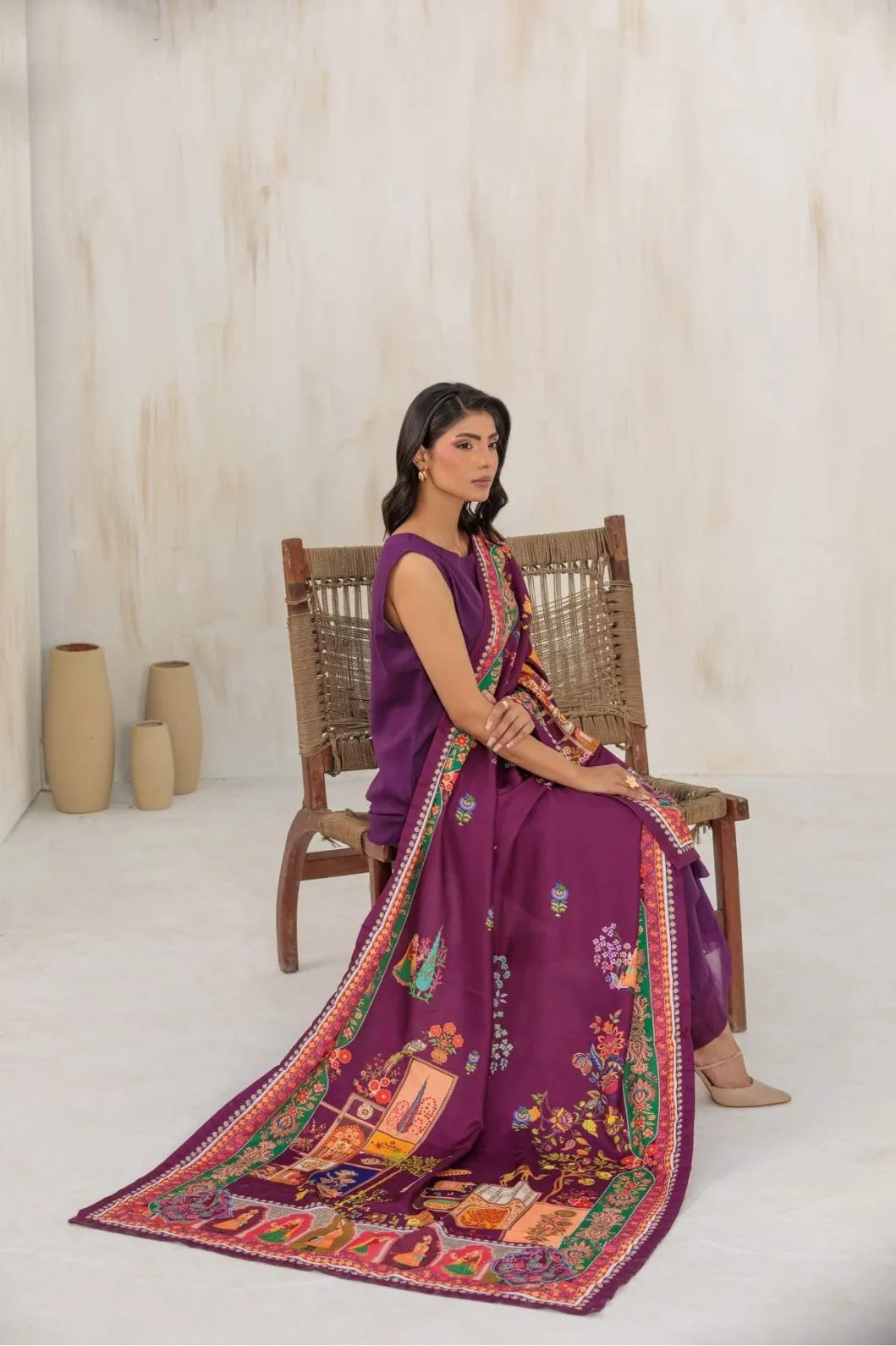 Zorah is an opulent shawl in a rich burgundy purple shade, radiating warmth and sophistication. Its intricate patterns and refined artistry bring together tradition and elegance, making it a versatile yet striking piece. The unique hue, balanced between purple and wine, adds depth and allure, perfect for elevating winter evenings, festive occasions, or graceful everyday styling.